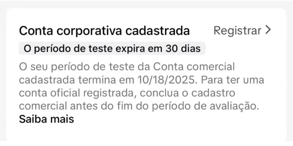 This gives your profile access to a 30-day trial period. To activate your corporate account, you need to register some business details, such as: Legal name of the company, address, CNPJ (Corporate Taxpayer ID), and other optional details.